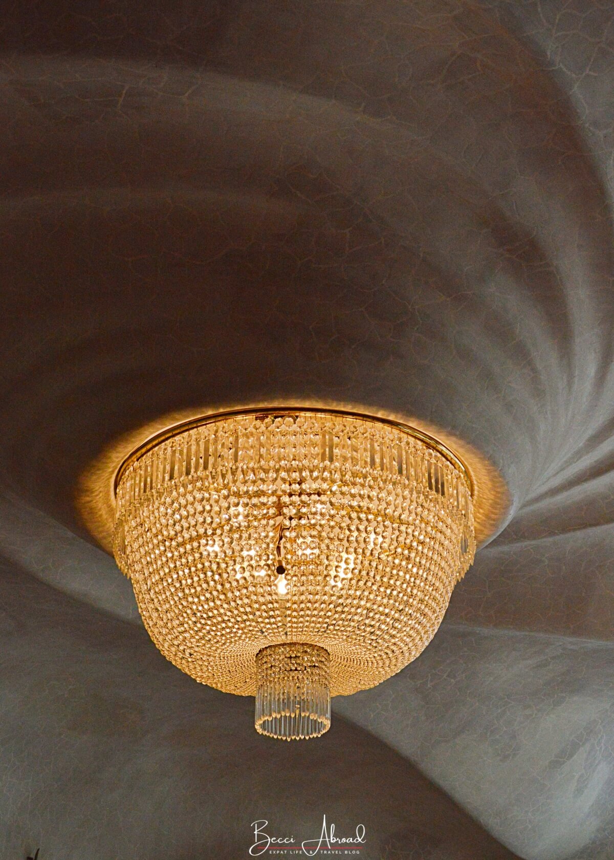 The ceiling is shaped like a seashell, giving the impression that every part of it leads towards the center, where an elegant chandelier hangs.