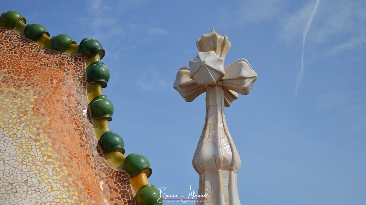 On Casa Batlló, the wavy roof with the colored ceramic tiles is said to represent the dragon’s back. And the large four-armed cross above the roof symbolizes the end of the knight’s sword, killing the dragón to free the princess.